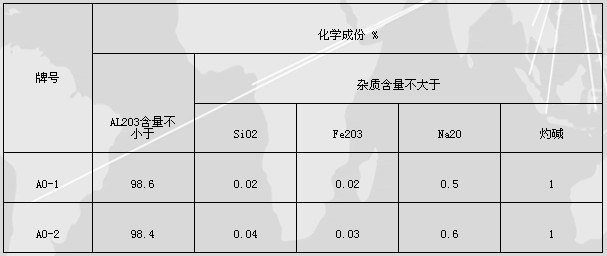 牌號(hào)化學(xué)成份 %AL2O3含量不小于雜質(zhì)含量不大于SiO2Fe2O3Na2O灼堿AO-198.60.020.020.51AO-298.40.040.030.61